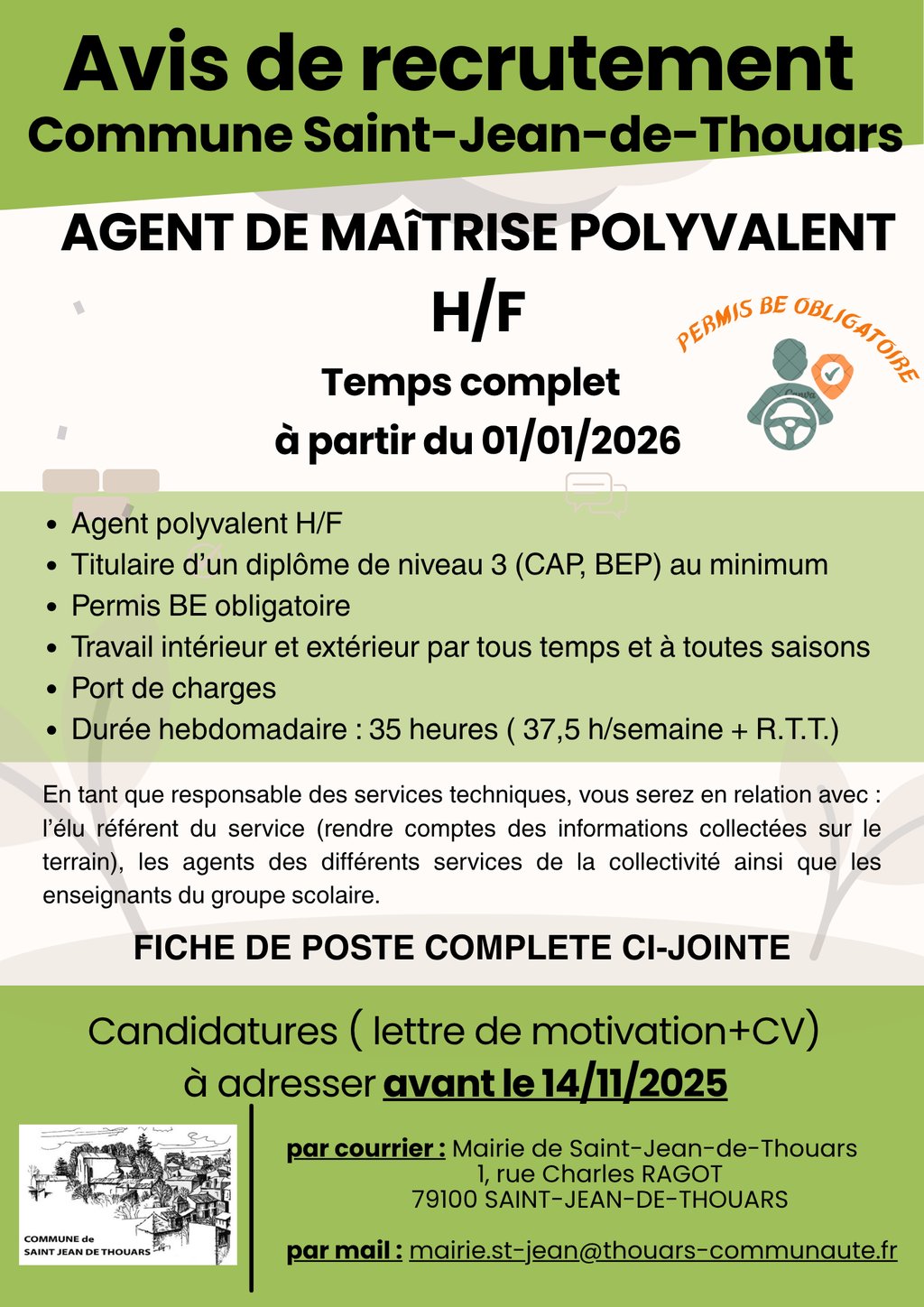 La commune de Saint-Jean-de-thouars recrute un agent de maîtrise polyvalent H/F.