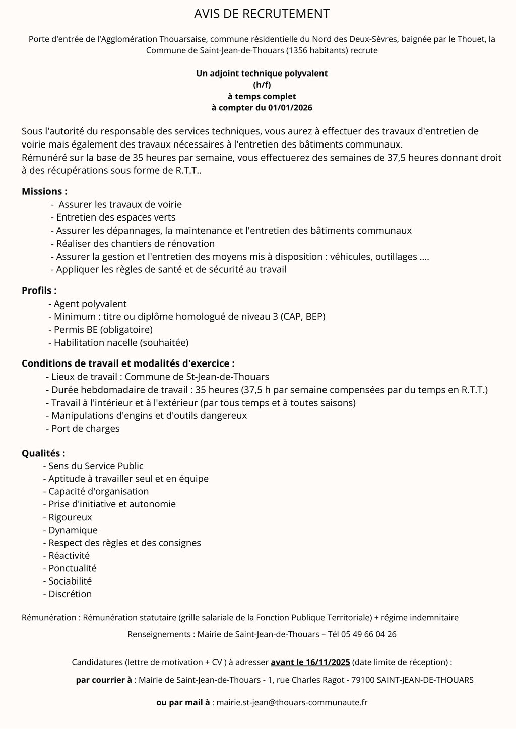 La commune de Saint-Jean-de-thouars recrute un adjoint technique polyvalent H/F.