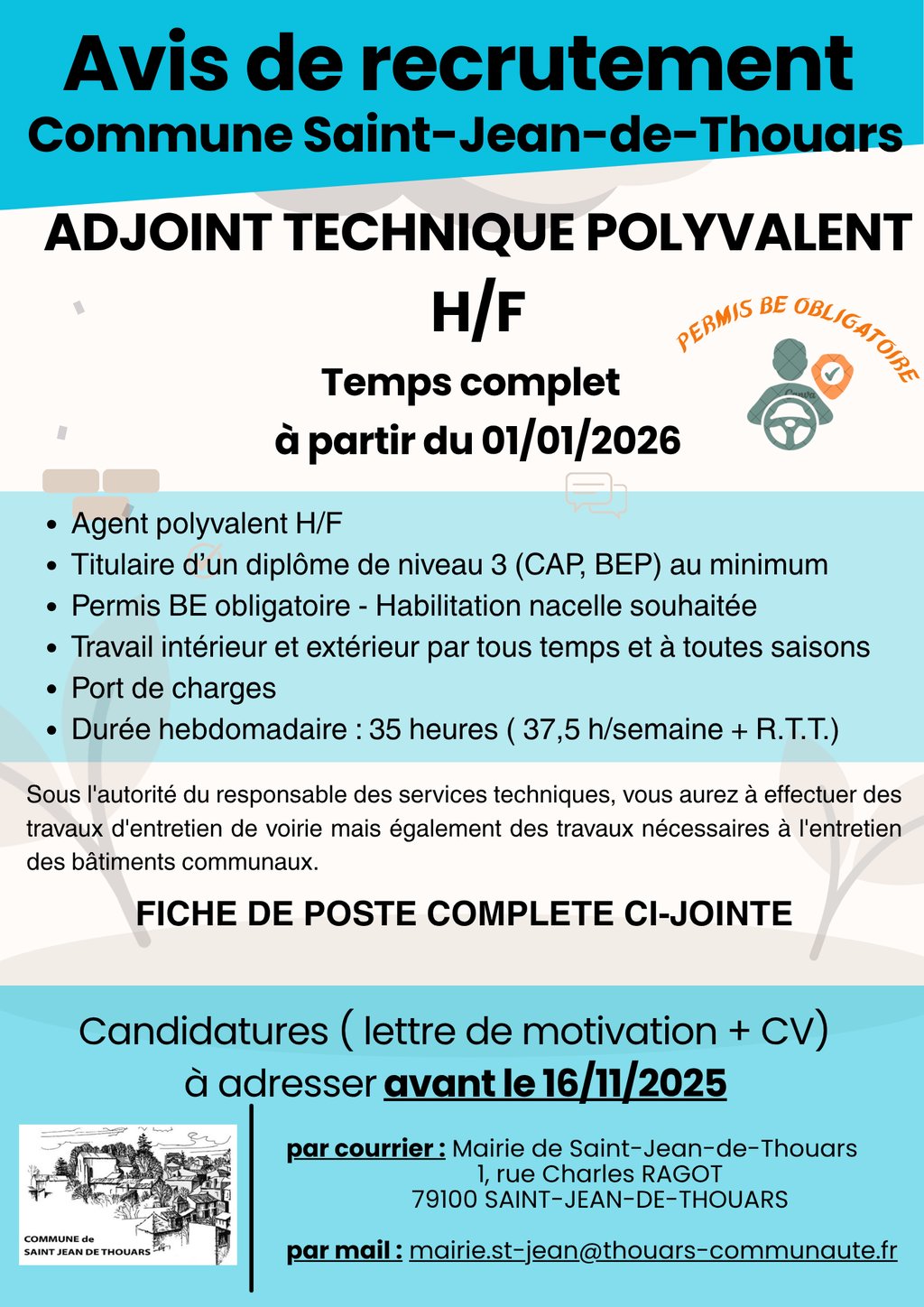 AVIS DE RECRUTEMENT : ADJOINT TECHNIQUE POLYVALENT H/F
