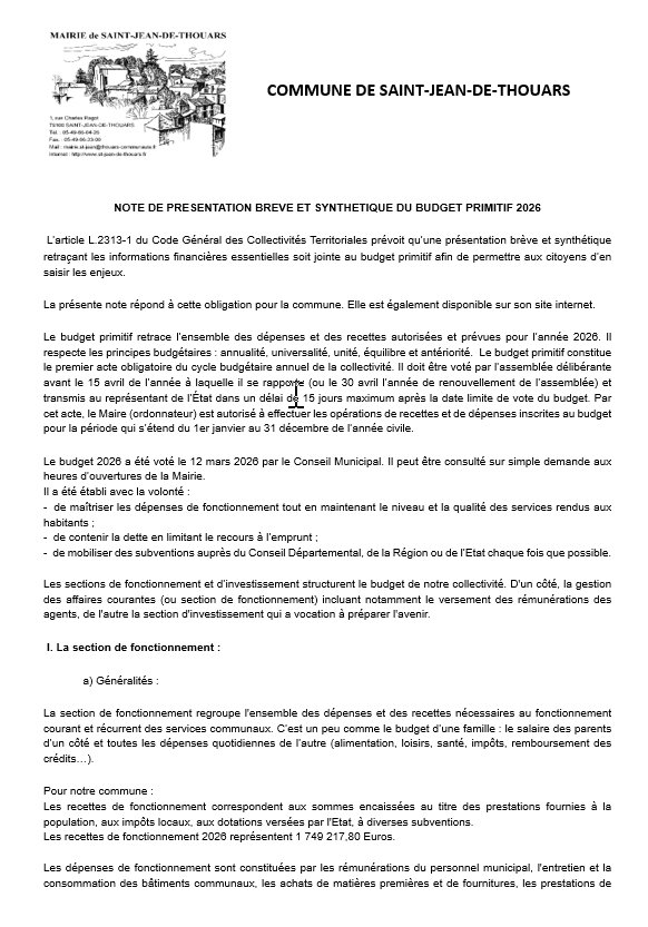 A la suite du conseil municipal qui s'est tenu le jeudi 12 mars 2026, veuillez trouver ci-joint la note de présentation brève et synthétique du budget primitif 2026.