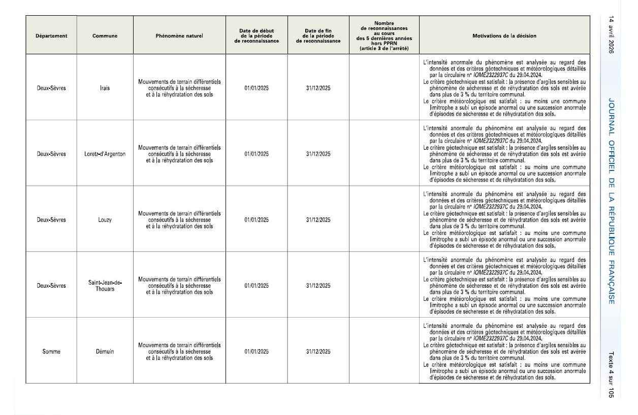 La préfecture des Deux-Sèvres vous informe que l'arrêté du 3 avril 2026 portant reconnaissance de l'état de catastrophe naturelle a été publié au journal officiel le 14 avril 2026.