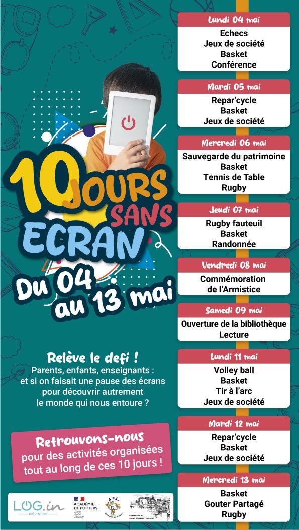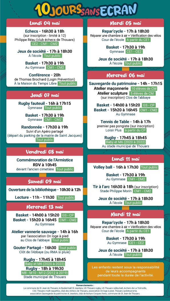 Merci à Simon Garnier pour la réalisation de ce flyer et merci à Thouars cyclotourisme, au Basket-Ball Saint-Jeantais, au club de lecture de St Jean, à l'UST volley-ball, à l'UST rugby (école de rugby et rugby fauteuil), au CSC Thouars multi-raquettes, aux Archers de la Trémoïlle, à l'association Sauvegarde du patrimoine, au club des échecs de Thouars, à l'association On Loge à pied et à la commune de St Jean de Thouars pour leur participation à ces dix jours sans écran.