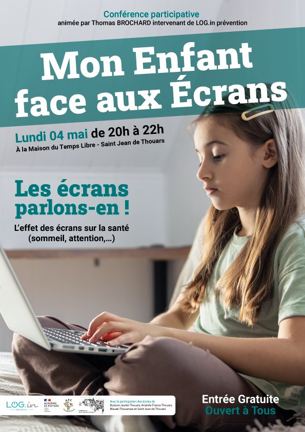Une conférence participative animée par Thomas Brochard (Log-in prévention) se déroulera le lundi 4 mai de 20h à 22h à la Maison du temps libre de St Jean-de-Thouars (voir affiche jointe). Organisée en collaboration avec l'Inspection de l'éducation nationale de Thouars, les écoles de Mauzé-Thouarsais, Buisson-Jaurès et Anatole-France, elle est ouverte à tous et gratuite !