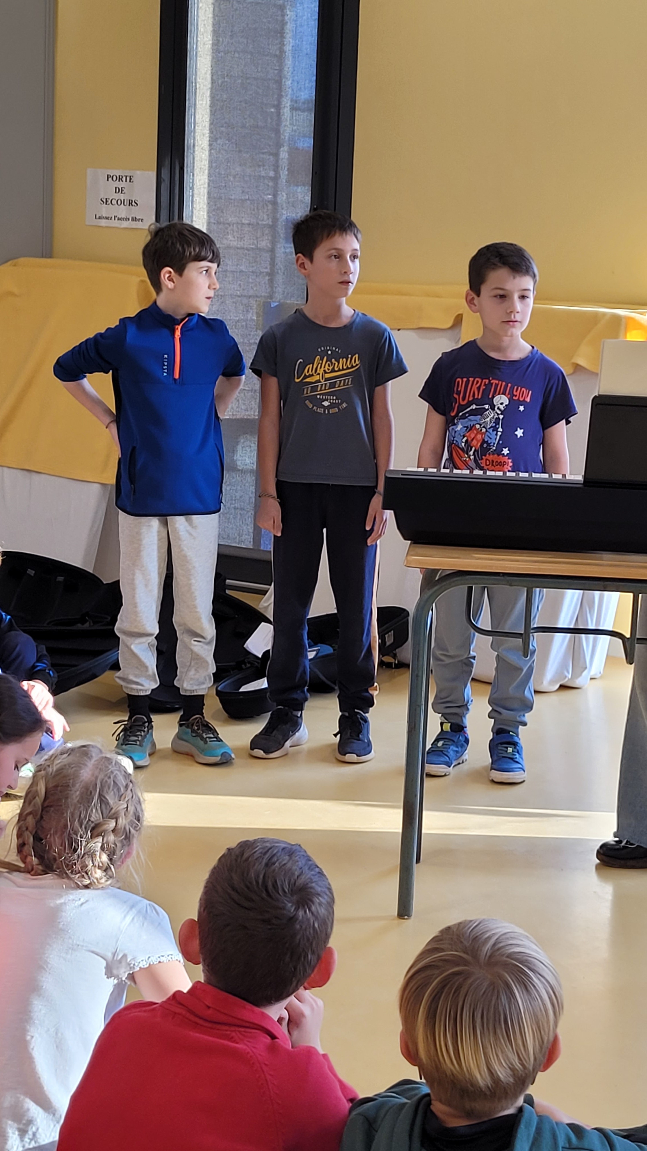 Sous la houlette de Lise et de nos musiciens professionnels : Hugo CHENUET et François-Xavier LAGUETTE, le public a pu se rendre compte des progrès accomplis par les enfants. Après un échauffement vocal, ils ont présenté le nouveau chant composé par Lise BOREL : " Nos cœurs battants", mais aussi le traditionnel " Vive le vent" de circonstance pour cette fin d'année. La séance s'est terminée de manière plus ludique avec un blind-test opposant Parents et enfants dans une ambiance chaleureuse.