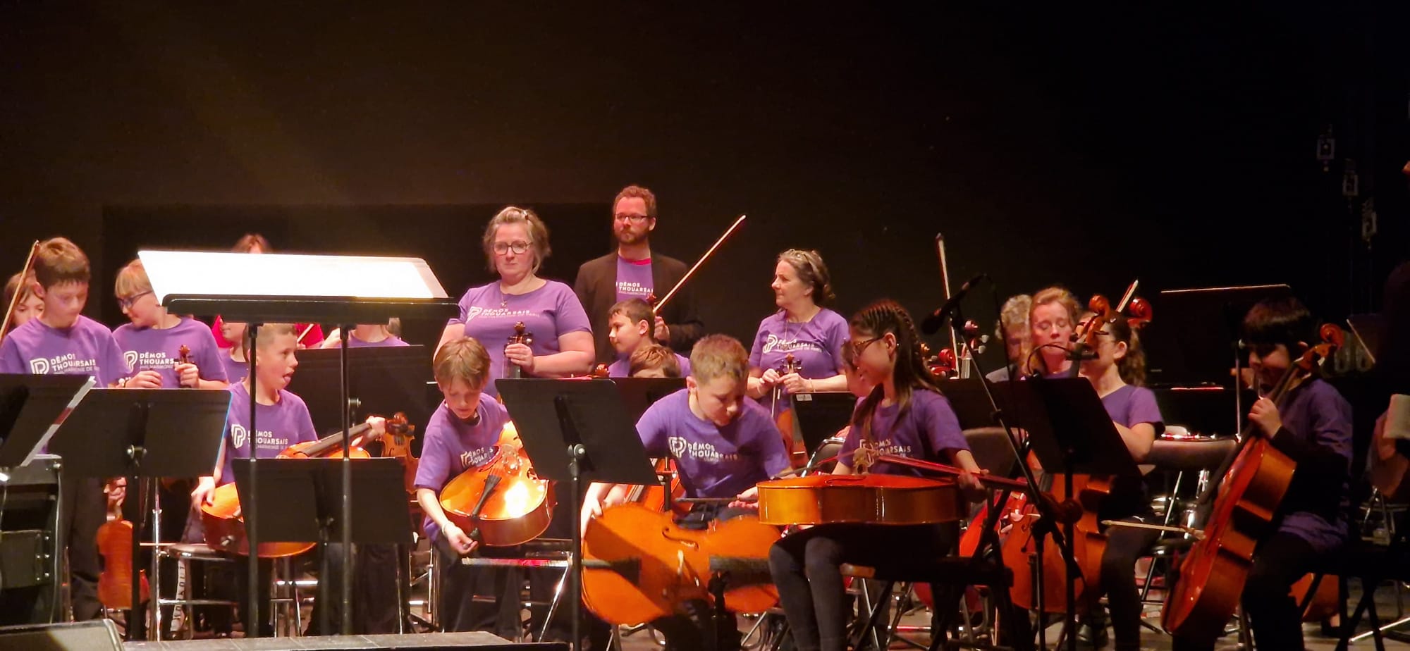 Mi-Janvier, notre atelier s'est vu annoncé une grande nouvelle : en effet l'orchestre Démos Saint-Jeantais a été retenu afin de se produire en lever de rideau de l'Orchestre Symphonique des Jeunes Thouarsais (O.S.J.T.) au théâtre de Thouars en compagnie de l'orchestre Démos de l'école Bois Baudron de Mauzé-Thouarsais. Il faut donc se mettre au travail très vite, car il nous reste que peu de séances pour être au point. Au fil des séances, les progrès de nos violonistes, altistes et violoncellistes se font un peu attendre, mais avec application et sérieux, ils écoutent les conseils des musiciens enseignants et progressent. Le travail collectif et individuel finit par payer (l'entraide entre enfants aussi) : nos musiciens sont prêts…